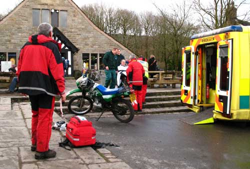 Whilst in the Rivington area providing standby rescue cover for the Winter Hill Fell Race, the team was contacted direct by NWAS (Lancashire area) A&E Control to respond, due to our being in the close vicinity, to the report of an elderly man who had collapsed inside the cafeteria at Great House Barn (locally known as the Bottom Barn) in Lever Park, Rivington. The team was contacted at 12:25 and our BM4 vehicle with 3 persons on board was quickly mobile and arrived on scene within minutes, followed by our team leader.