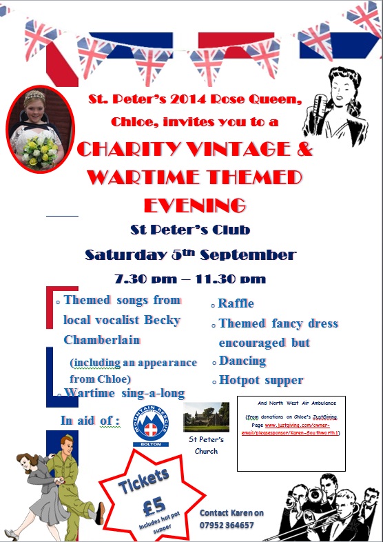 Just wanted to let you know that everything is booked now for chloe’s Vintage & Wartime themed evening at St Peter’s Club, Chorley on 5th September. Proceeds from the night are being split between BMRT and her church for this one and we’ve set up a just giving page for donations to NWAA for anyone who wants to support her but can’t make the evening. Anyone who wants to come along on the night is more than welcome.